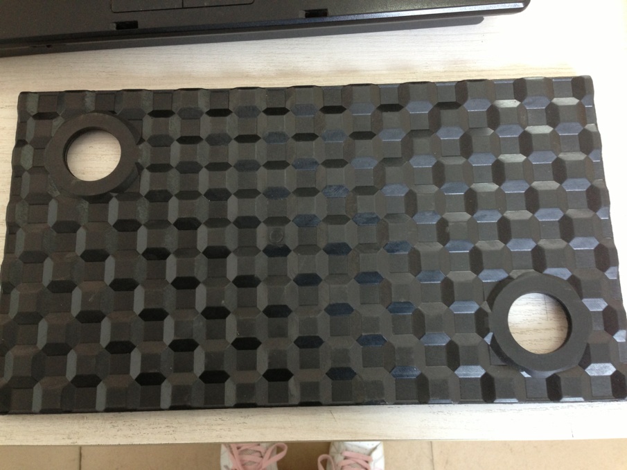 热塑性聚酯弹性体(TPEE)垫板,用于铁道的轨道(轨枕)中,用于减弱车辆行进时产生的振动和噪音,用于降低轨道的振动和噪音。新型垫板包括垫板本体,上、下表面均设置有多个凸台,其特征在于:表面多个凸台(2)呈矩形阵列布置,(2)为四棱台,棱与棱之间相互搭接,垫板本体下表面的凸台与上表面错位设置。新型高弹性聚酯减振垫板,刚度低、弹性恢复速度快、使用寿命长、有利于环保。
